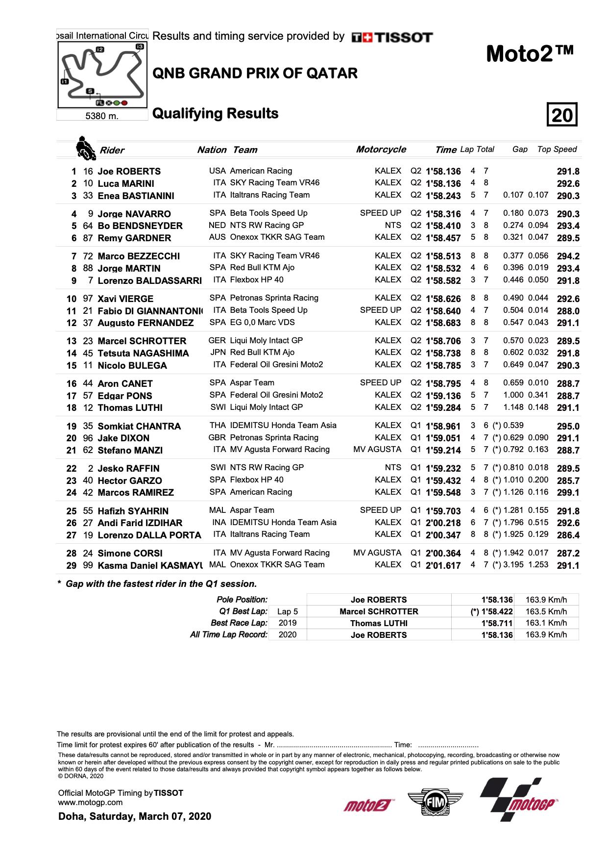 Moto2 2020 Qualifying Results